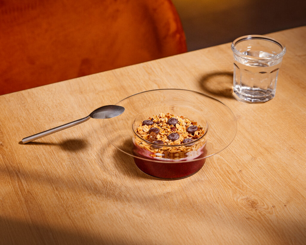 Iaurt, granola crocantă și chia hidratată în piure de fructe de pădure. Un desert sănătos și irezistibil.