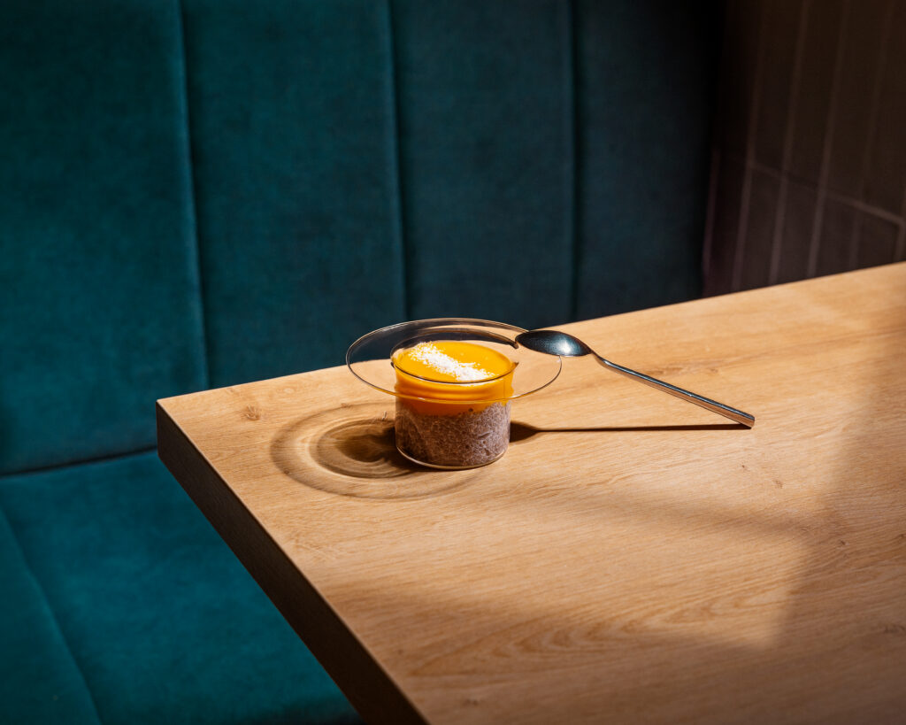 Chia hidratată în lapte vegetal și mango dulce într-un desert exotic și sănătos.