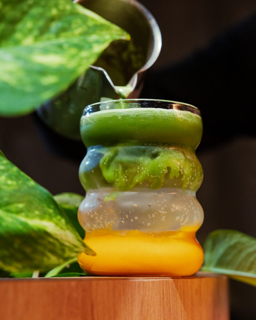 Matcha rece cu apă tonică și piure de mango – fresh, exotic și super energizant.